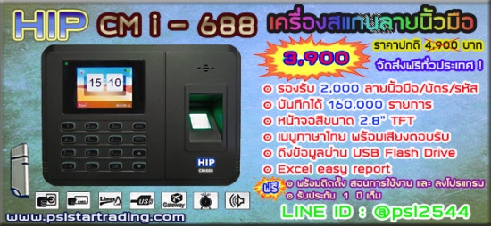 คุณสมบัติหลักของเครื่องสแกนลายนิ้วมือ cmi688- รองรับการสแกนได้ 3 รูปแบบคือ (1) สแกนลายนิ้วมือ (2) ทาบบัตร (3) กดรหัส- เก็บลายนิ้วมือได้สูงสุด 2,000 ลายนิ้วมือ 2,000 บัตร และ 2,000 รหัส- รองรับรายการบันทึกได้ 160,000 รายการ- จอสี TFT ขนาด 2.8 นิ้ว- เมนูไอคอน และเสียงตอบรับภาษาไทย- ความเร็วในการสแกน 1 วินาที- รองรับการดาวน์โหลดข้อมูลผ่าน USB flash drive- ให้รายงานในรูปแบบ Excel